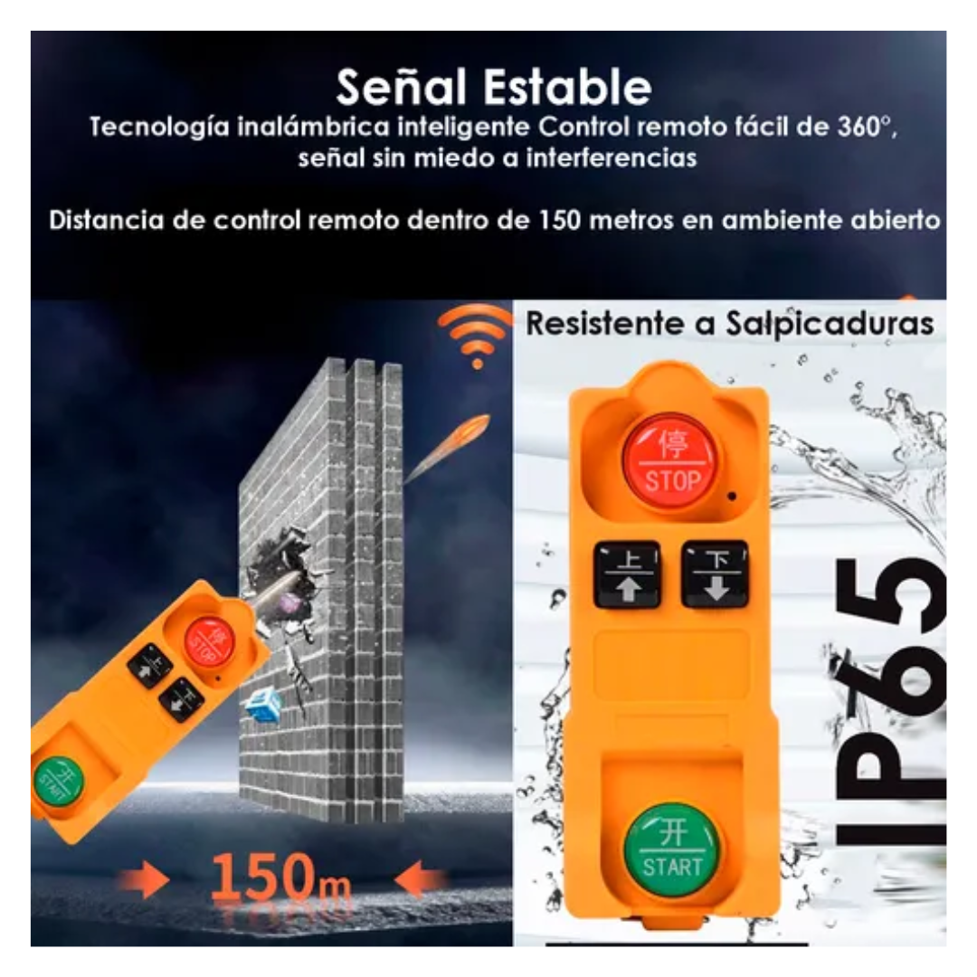 Equipado con un potente motor de 1050 W, este tecle eléctrico garantiza un rendimiento óptimo y durabilidad. Su diseño inalámbrico y el control remoto facilitado brindan la comodidad necesaria para operar el equipo desde una distancia segura, mejorando la eficiencia de trabajo en cualquier entorno.