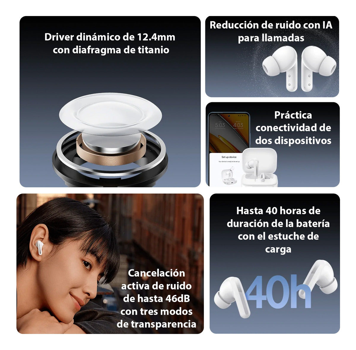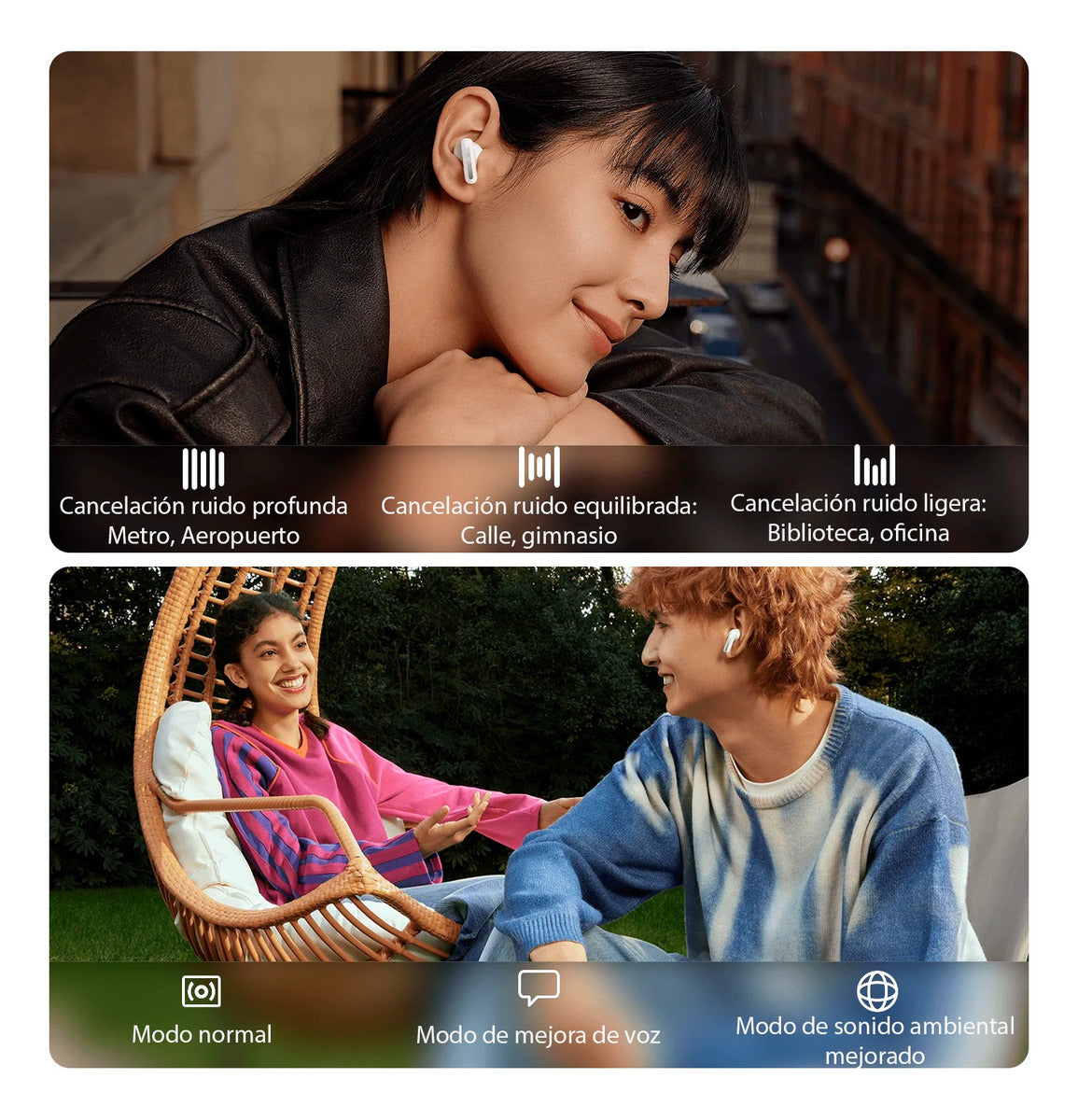 - Con 3 modos de transparencia: Modo normal, Modo mejora de voz, Modo sonido ambiental mejorado