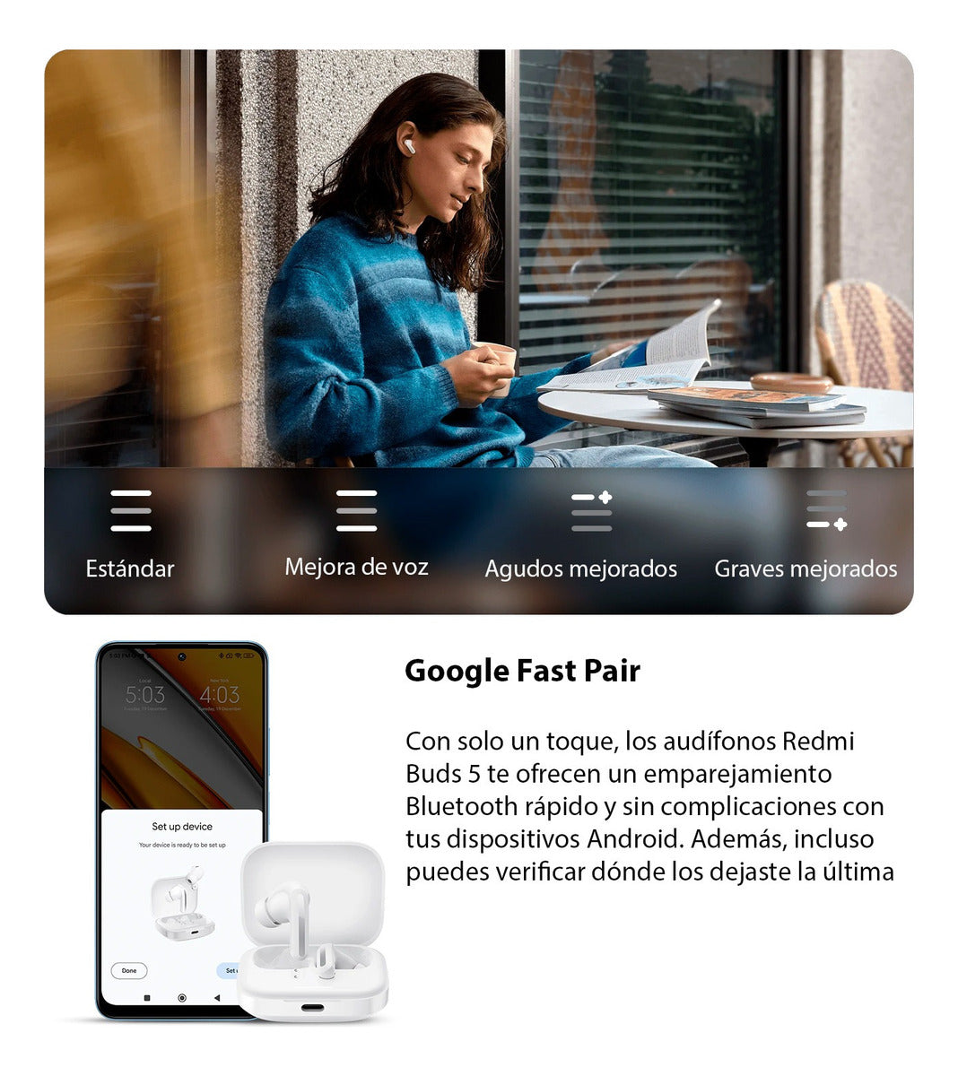 Conéctate sin esfuerzo a tus dispositivos Android gracias a Google Fast Pair: simplemente abre el estuche y con un toque estarás listo para disfrutar. Personaliza tu experiencia auditiva a través de la aplicación Xiaomi Earbuds, donde podrás ajustar la cancelación de ruido, configurar los controles táctiles y mantener tus auriculares siempre actualizados con las últimas mejoras de firmware.