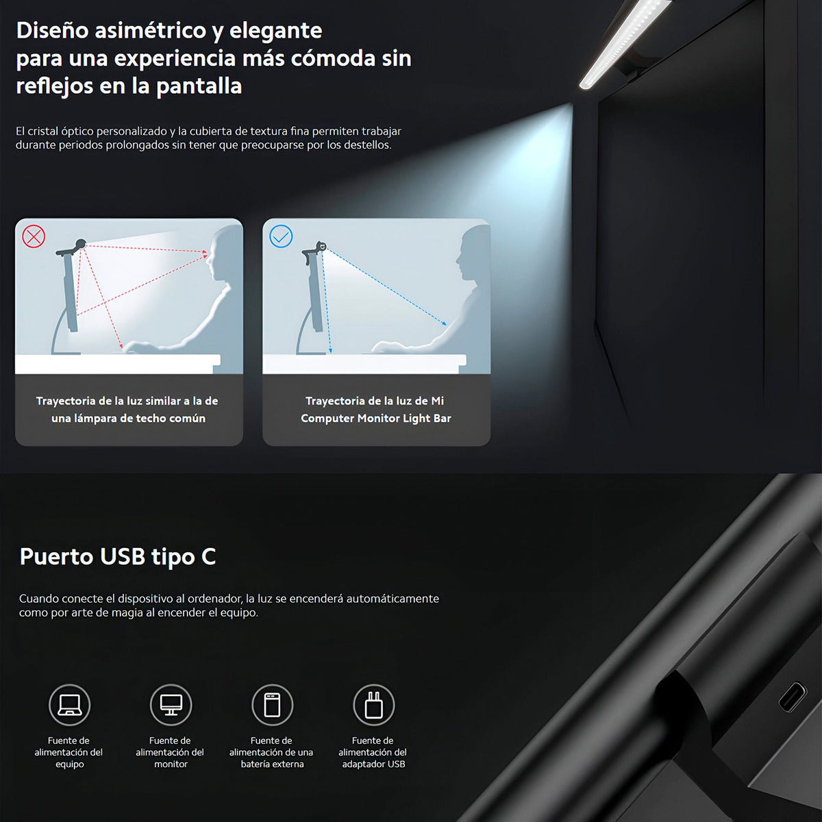 Fabricada con materiales de alta calidad y un cuerpo metálico negro elegante, la Mi Computer Monitor Light Bar no solo mejora tu productividad, sino que también añade un toque sofisticado a tu espacio de trabajo.