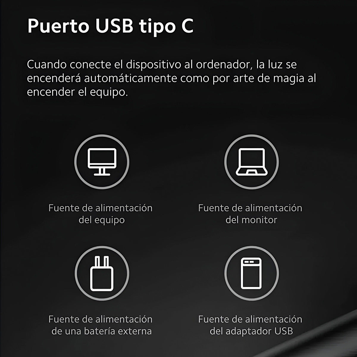 La instalación no podría ser más sencilla. Su sistema de rotación magnética de 25 grados y pivote ajustable de 40° la hace compatible con monitores planos o curvos de 1 a 32 mm de grosor. Solo necesitas conectarla mediante su puerto USB Tipo C a tu computadora, batería externa o cargador, y estarás listo para disfrutar de una experiencia visual superior.