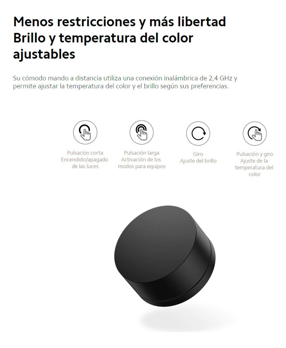 La versatilidad es uno de sus puntos fuertes. El cómodo mando a distancia inalámbrico de 2,4 GHz te permite ajustar el brillo y la temperatura del color (desde 2700K hasta 6500K) con simples gestos: una pulsación corta para encender o apagar, una pulsación larga para activar los modos preestablecidos, un giro para ajustar el brillo, y pulsación con giro para modificar la temperatura del color.