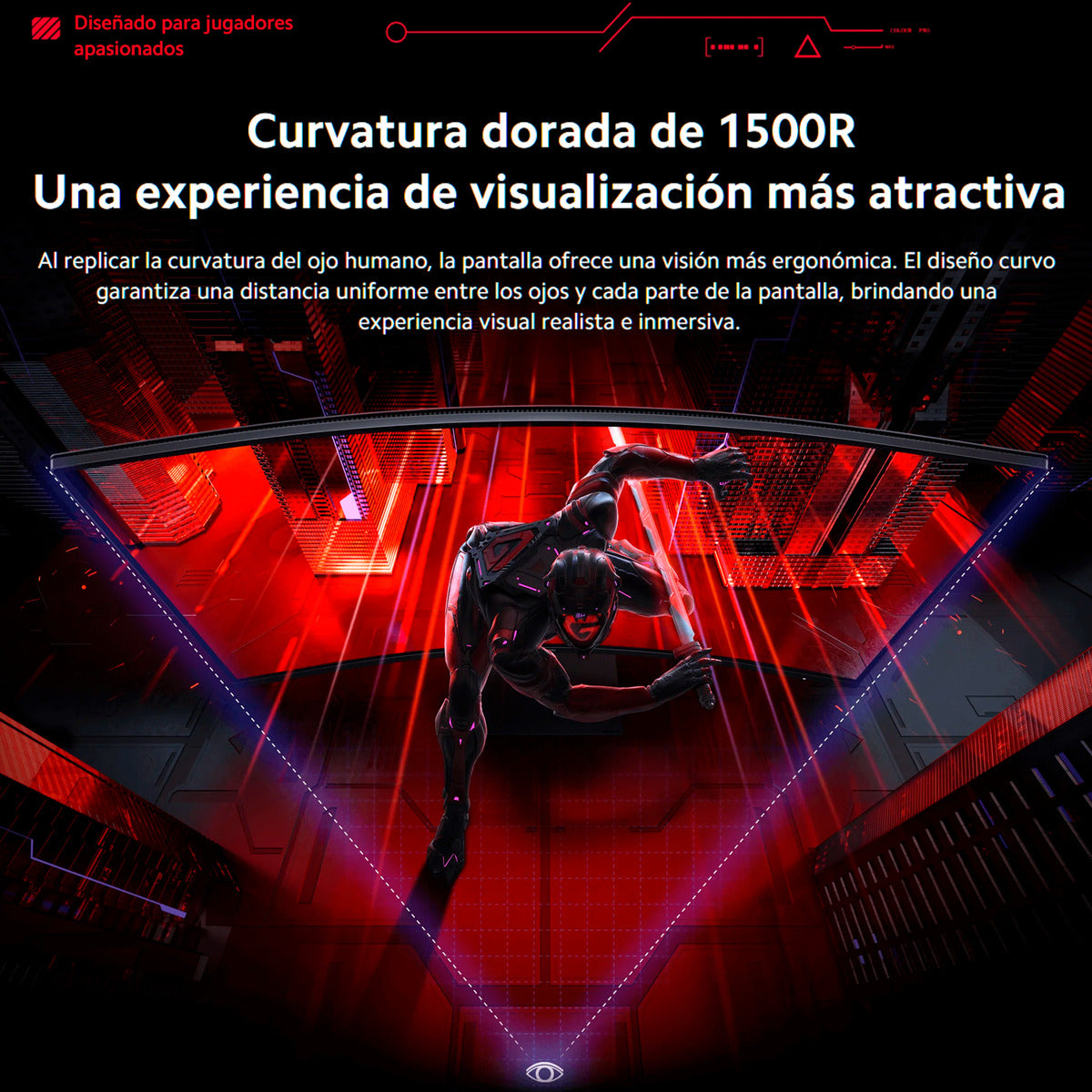 Al replicar la curvatura de los ojos humanos, la pantalla ofrece una visualización más ergonómica. El diseño curvo garantiza una distancia constante entre los ojos y cada parte de la pantalla, ofreciendo una experiencia visual realista e inmersiva.