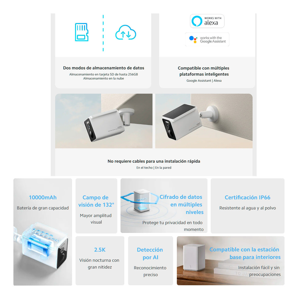 Se conecta inalámbricamente a la estación base incluida (hasta 300m de alcance), sin necesidad de router. El cifrado financiero protege tus grabaciones, almacenadas localmente en microSD (256GB max) o en la nube. Compatible con Google Assistant y Alexa para integrarla en tu smart home.
