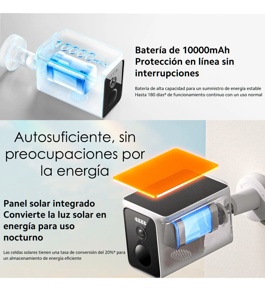 La BW400 Pro de Xiaomi resuelve el principal problema de las cámaras exteriores: la autonomía. Su panel solar integrado (20% eficiencia) recarga la batería de 10,000mAh que ofrece hasta 6 meses de uso continuo. El sistema optimiza el consumo activando grabaciones sólo cuando detecta movimiento real, no hojas o sombras. Olvídate de cambiar baterías o tender cables.