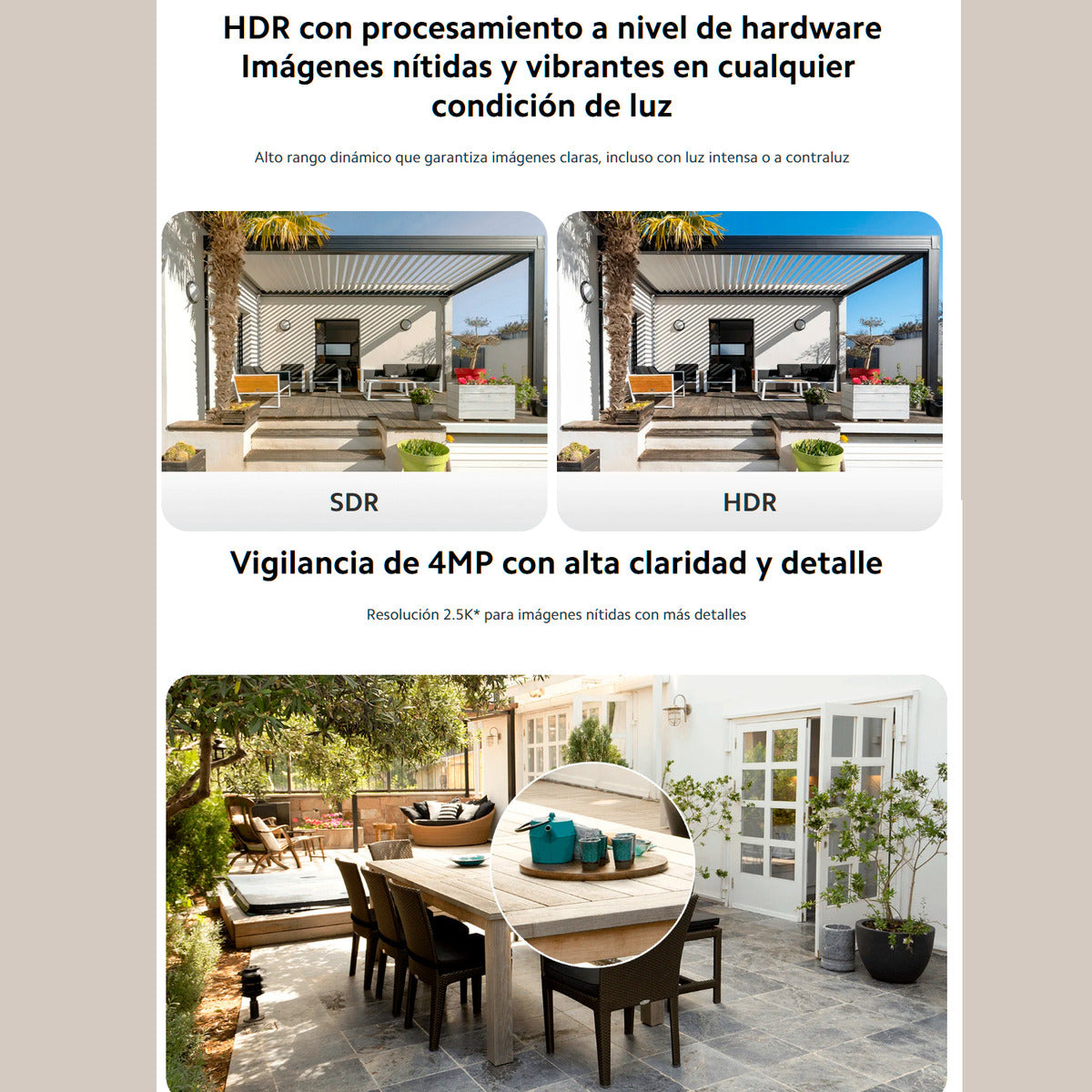 El sensor de 1/2.7'' con apertura f/1.6 capta más luz, mientras el HDR hardware equilibra escenas con contraluces. De noche, 4 LEDs infrarrojos + 2 de color proporcionan visión nocturna nítida hasta 10m. La resolución 2.5K (2560x1440) QHD muestra detalles imposibles en cámaras 1080p, como matrículas o rostros a distancia.