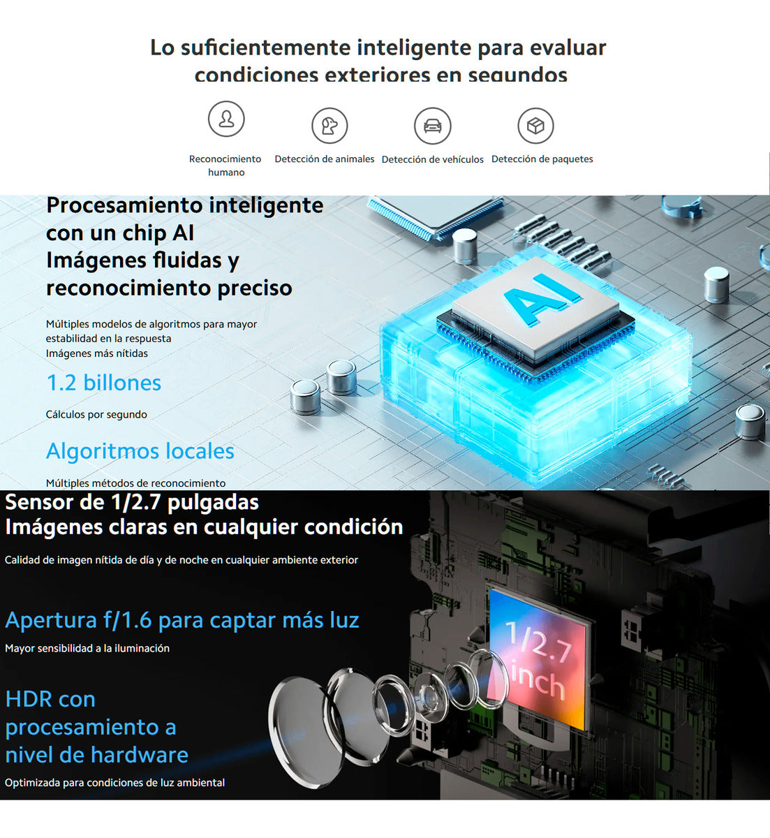 El chip MJA1 con capacidad de 1.2 billones de operaciones/segundo diferencia entre personas, mascotas, vehículos y paquetes. Puedes delimitar zonas de detección específicas y recibir alertas precisas en tu móvil. La tecnología de cancelación de ruido mejora el audio en las llamadas bidireccionales con el repartidor o visitantes.